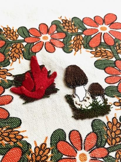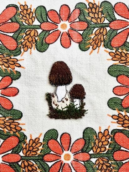 ハイキング中に見つけ、撮影したキノコをモデルにして刺繍しています。